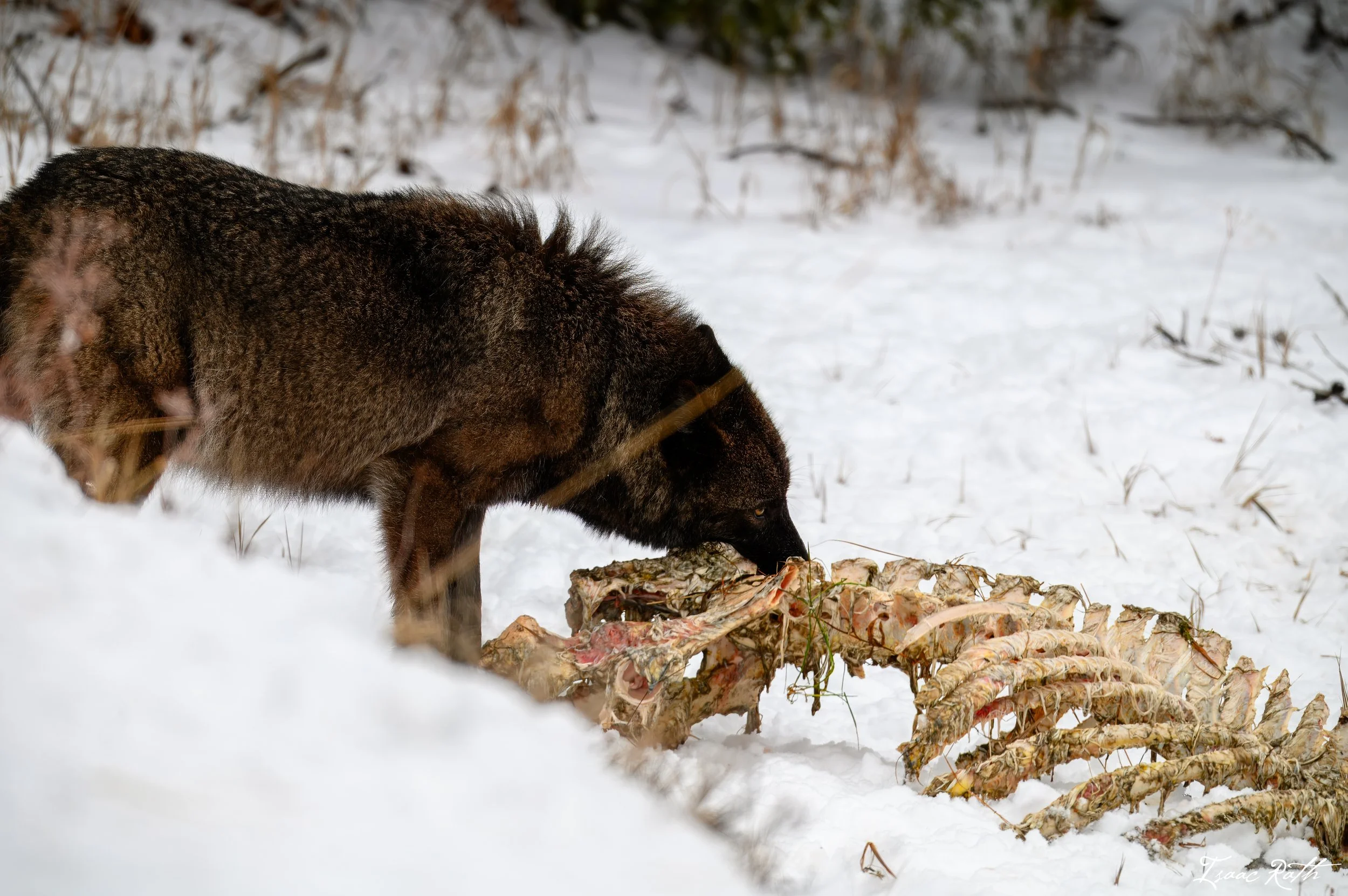 The next morning looked very similar, with fellow guides at Madison Warming Hut telling me that they were gone and the carcass was picked clean. Seeing as they had said the same the morning before, we took our chances and went west toward the carcass anyway. As we got close, we saw some coyotes and tons of ravens feeding on the remnants of the bison. My guests were happy with this, so we made many passes for them to get their photos and observe the scene. There was even a pullout to use for us to stop and get out. The park service had removed the signs and cones. We ate lunch here, but after a while with no new activity, we moved in the direction of a restroom for a quick pit stop before making one last pass, hoping to find what we were really looking for. It turned out to be the right choice, as when we returned, there as a skittish coyote moving in the wrong direction of the carcass and a black wolf was dragging the carcass out of the river and onto the bank. He hung out for a bit before leaving, and then the coyotes returned. One of them decided to serenade us (or another coyote, who knows!), which I’ve attached a video of in this post.