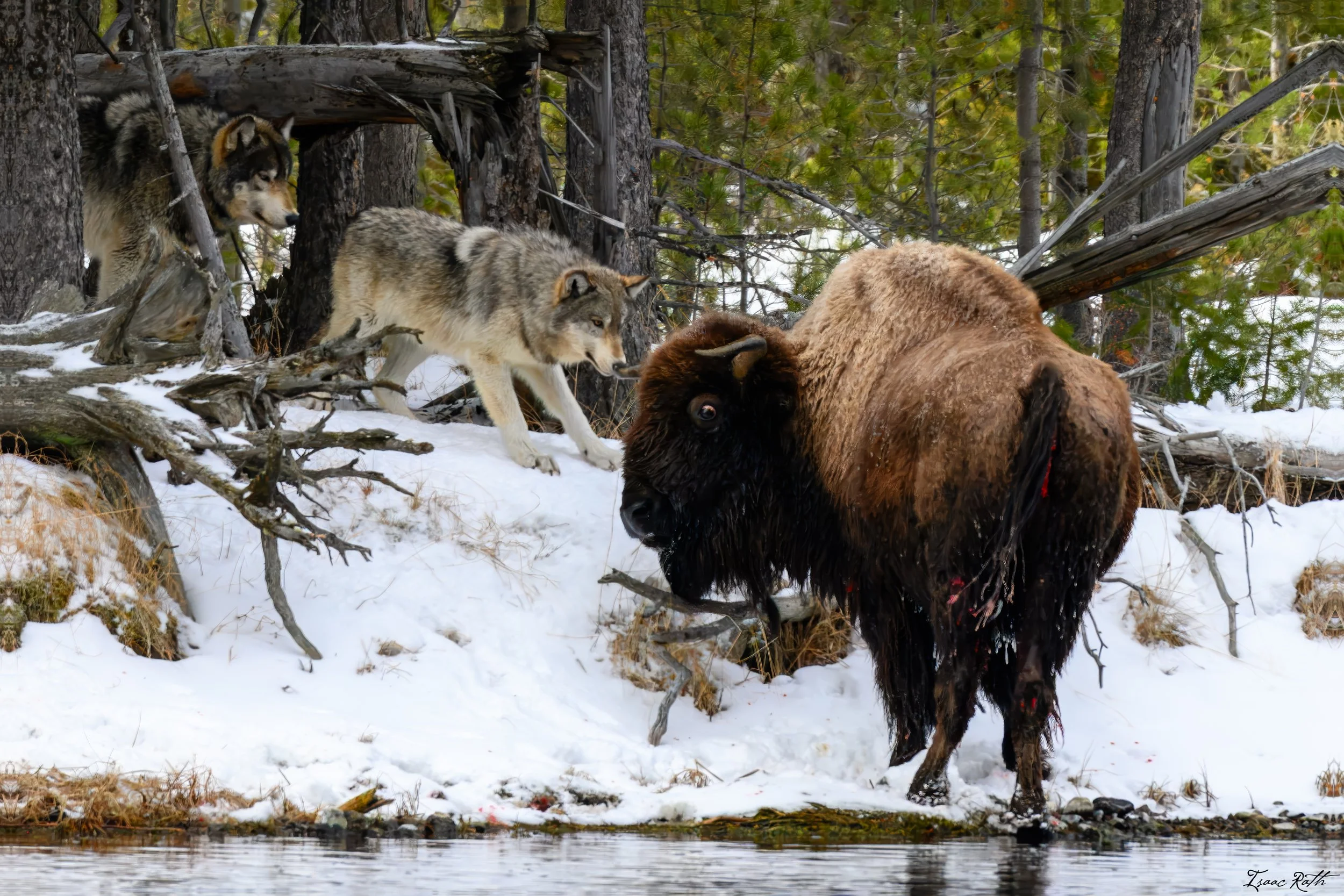 As we watched and waited, multiple wolves came in and out of the forest, some to help harass the bison, others to watch. The Wapiti Lake pack, unfortunately, lost all of their pups this year to a disease outbreak, so there was no teaching to be done - these were all experienced hunters. However, in a family of this size, it pays to rest when you can and take turns wearing down the target. At one point in the day, we ran back to Madison Warming Hut for a restroom break, and when we did so, we encountered a single black wolf on the road. We watched him for a while and even got to see him take a swim across the river to get back to the pack.