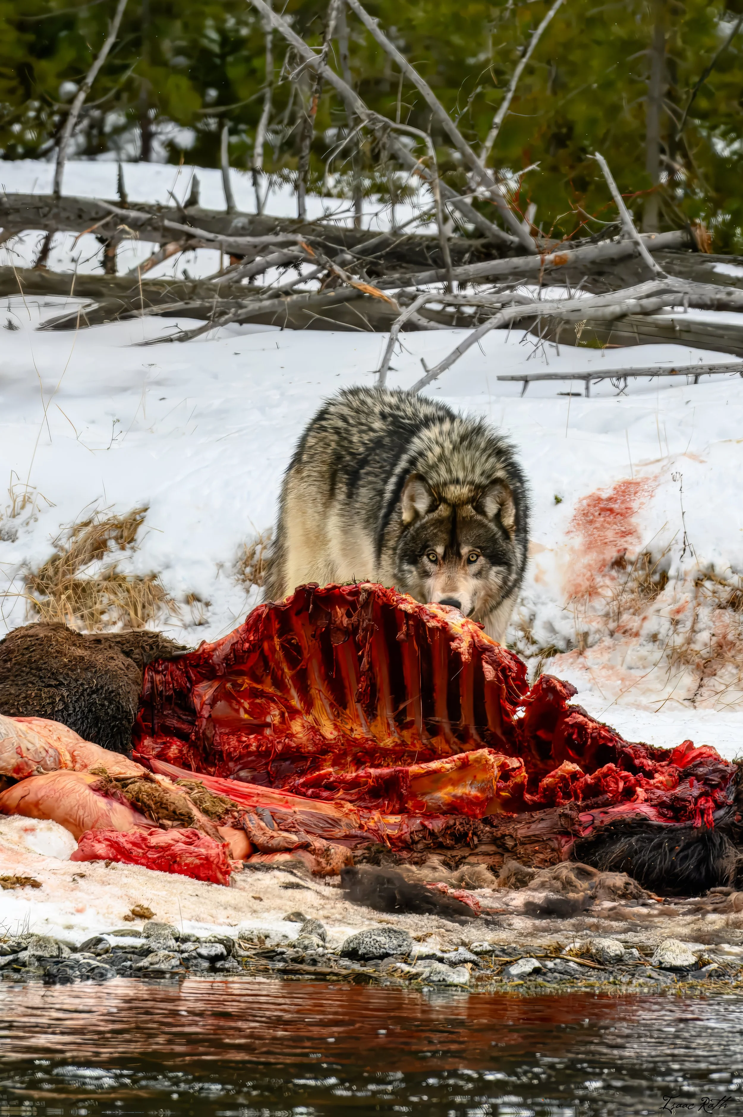 Eventually, the bison had had enough harassment and started to cross the river to the other side so the wolves would stop harassing her. When she did this, multiple wolves came in and started eating the snow that she had dripped blood on. We could hear them whining and whimpering to each other. Now, the bison was on our side of the river, which was not good because if she died on that side, we would not get a good sighting of the wolves or scavengers. When we left, the bison was on our side of the river, and from this point on, I don't know what happened that night, but I am speculating.