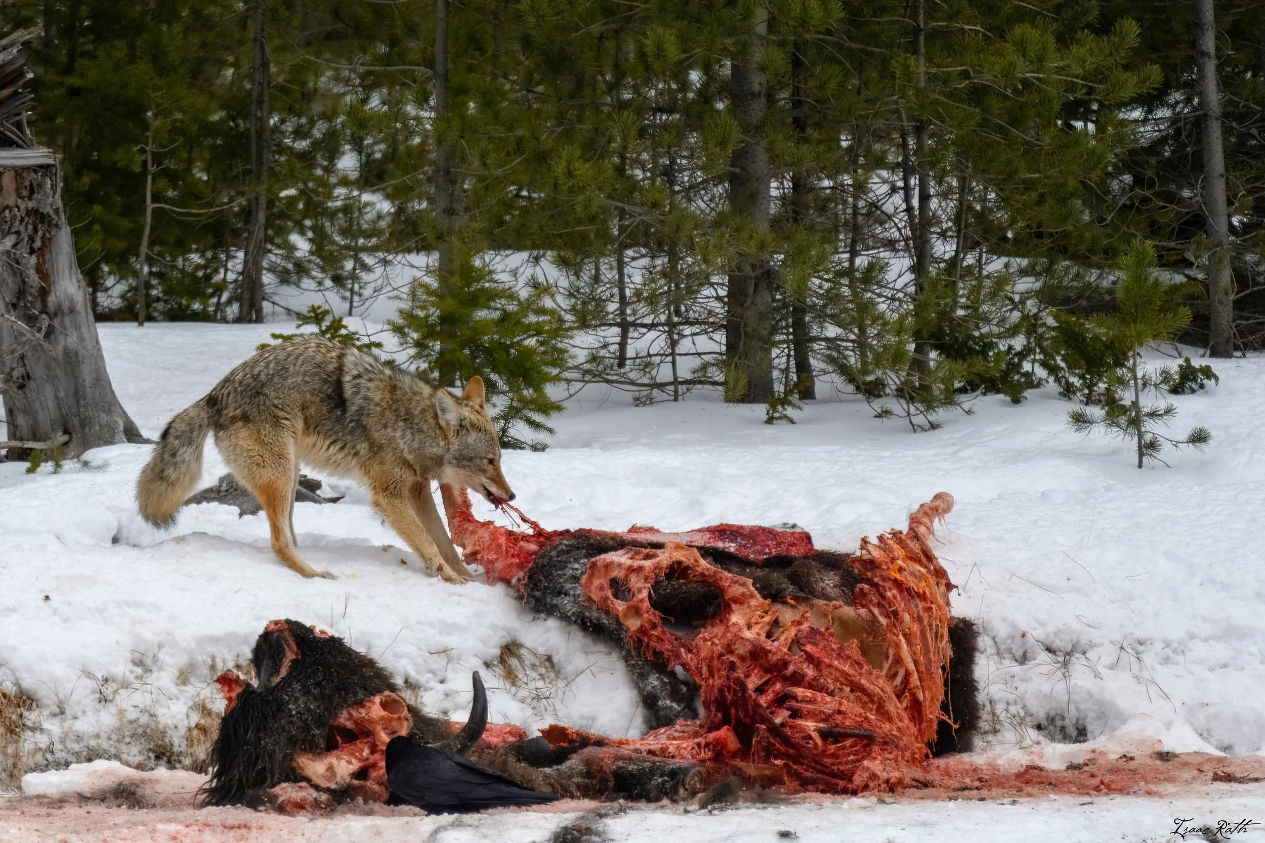 When the wolf left, it was quiet again for a while before the howling started again, and another wolf came down shortly after. Same as before - skittish, tail tucked, looking around nervously. After about a minute of feeding on the carcass, another wolf came in, and once that other wolf came, her tail was no longer tucked but wagging and more confident. For some reason, this other wolf made her very comfortable and confident. We watched these two feed for about 45 minutes until we had to leave to get back to the Old Faithful Snow Lodge.