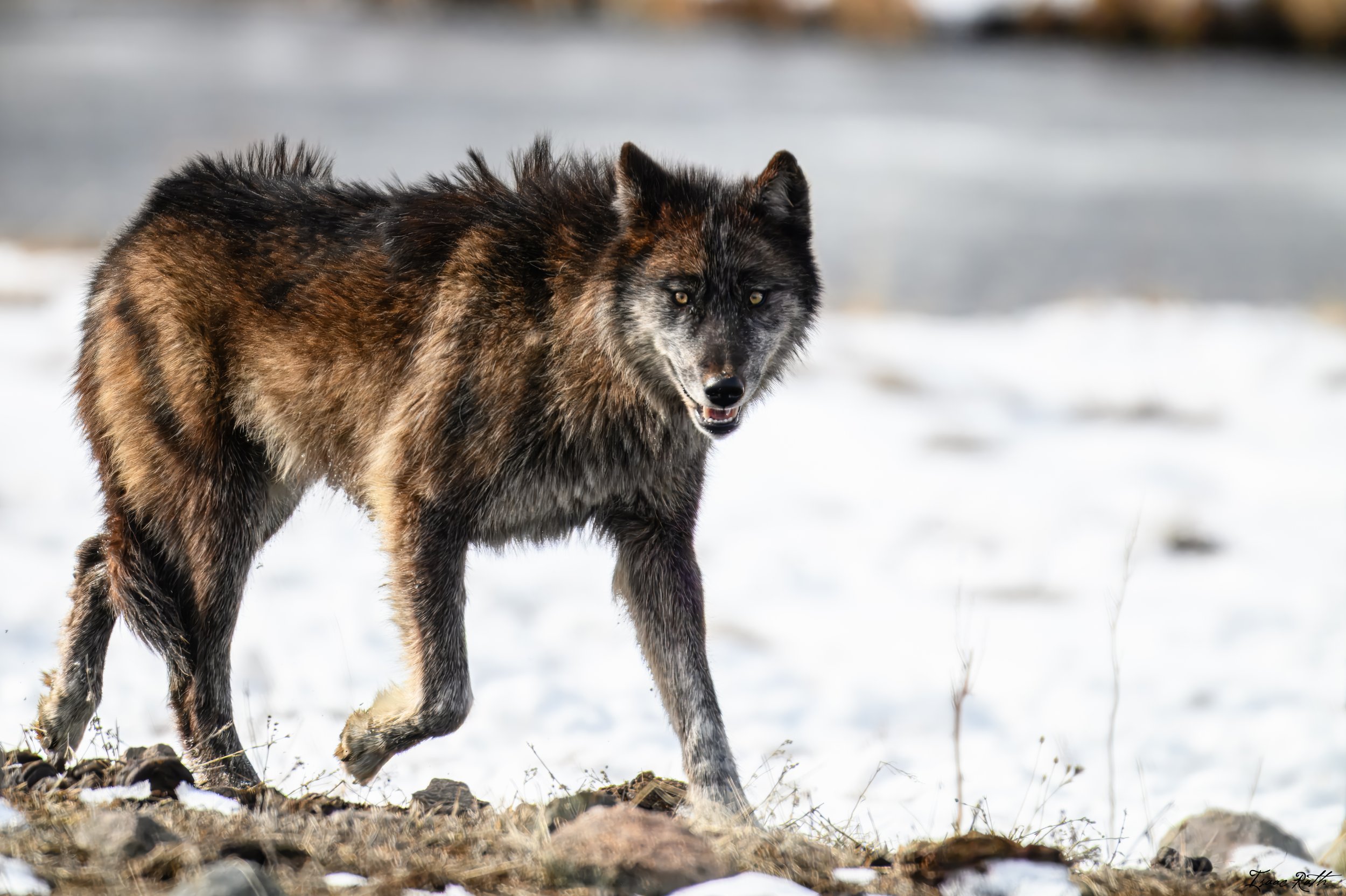 When we left in the late afternoon, the bison was still alive. When we returned in the morning, the wolves’ hunger had been satiated. Luckily, the wolves took her down on the far end of the river, so we were in a safe place to view from the road. We’d only seen about five members of the pack the previous day, but today we noticed tons of tracks leading down the hill and across the river, so we guessed that when it was time for the takedown, some more members of the pack showed up to help.