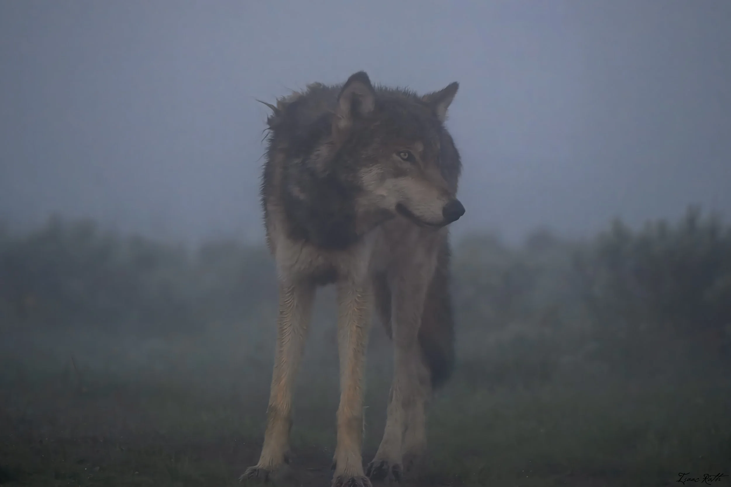 On June 14, 2025, we had yet another encounter with the Wapiti Lake wolf pack in Yellowstone National Park. We departed Old Faithful employee village early in the morning so that we could beat the sunrise to Hayden Valley. We had heard from our fellow guides that there was a carcass across the river from the den, and where there’s a carcass, the wolves will go. As we waited for the sun to rise and burn off the thick fog, Katie fell asleep in the car, and I stepped out to talk to a few people nearby. A few minutes passed, and when I turned around to check on Katie, I was stunned to see a gray wolf in the mist, only about 10 meters away from car (and me!). I rushed for my camera and the safety of the car and quickly woke Katie, who had just a moment to process that there was a wolf right outside of our parked car.