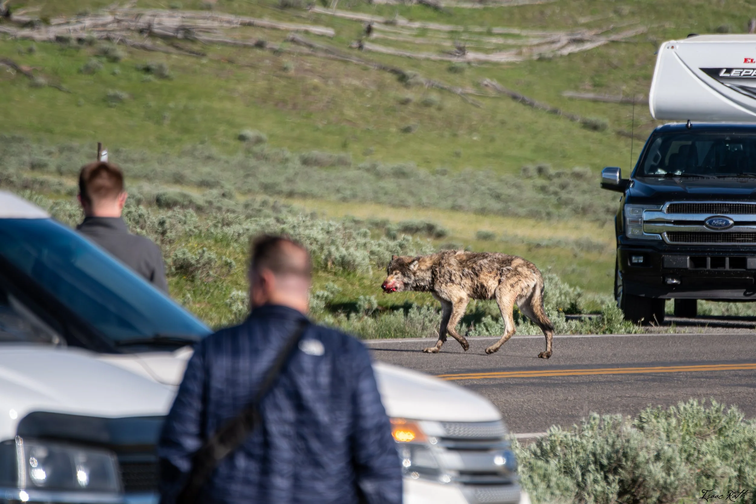 She returned upset, as it was painfully obvious to her that the wolf was in distress. The crowds were borderline harassing the wolf, who seemingly wanted to make its way back to the den to feed the pups. There was ONE (young and seemingly inexperienced) park ranger in this whole area to keep people in line, and there were at least 250-300 people there, half of whom were way too close to the wolf. Parents were letting their children run around, scream, and yell, and cars were stopping on the road and blocking it’s path. We did what we could to advocate for the wolf, Katie loudly commenting that “the wolf is very stressed out," and to “give him/her space!” a few times, but unfortunately, most tourists care more about getting a photo or grainy iPhone video to post of Facebook to brag to their friends over the safety and health of the animal.