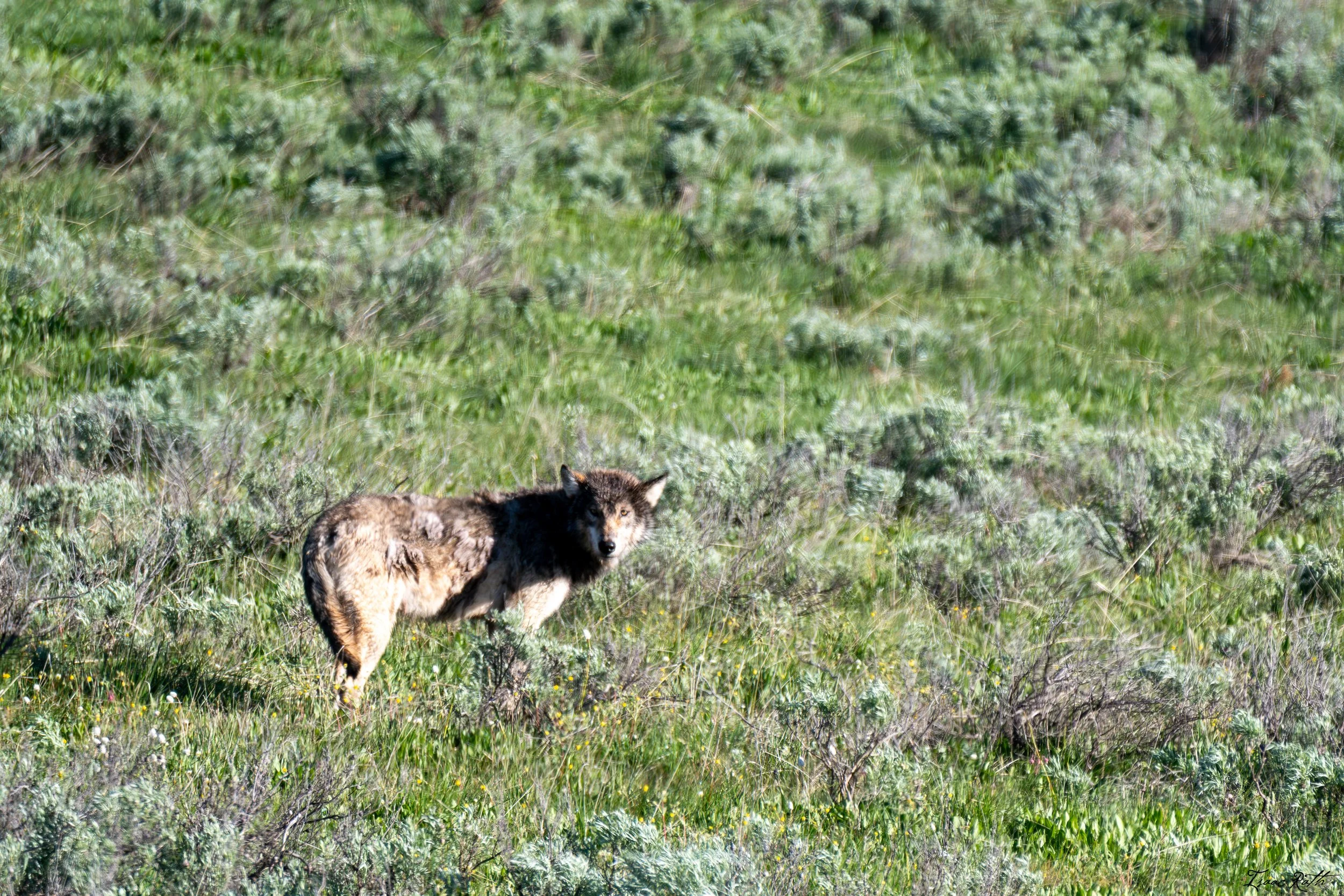 About an hour later, once the sun had risen and the fog had cleared, we spotted the wolves on the other side of the river, right where we predicted they would appear. We had been watching them for a while as they disappeared to and from the carcass that was hidden in a small patch of trees. Despite it being a day off work for both of us, we still spent the majority of the time helping others get a safe opportunity to watch wolves in the wild, and because we can’t help ourselves, we educated them about this pack and how important the reintroduction of wolves has been to the ecosystem. A few hours into the morning (around 8:30 am, what we like to call “Normal People Early”), when it was starting to get congested in the area, we noticed some commotion on the opposite side of the road. Katie went to investigate and discovered another gray wolf crossing the road.